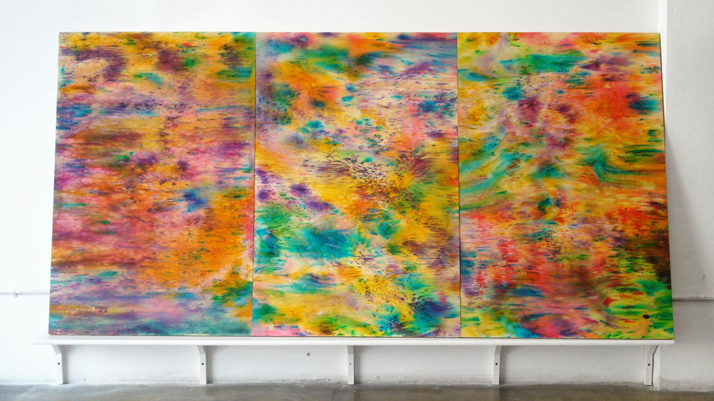 Taking place in the Open Studios, each installment of the study will be comprised of presenting their process of transforming the surface of natural wood sheets with dye and pigment to a visually saturated state, creating a graphic effect similar to multicolored galaxies or tie-dyed fabric.