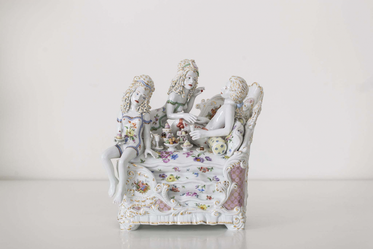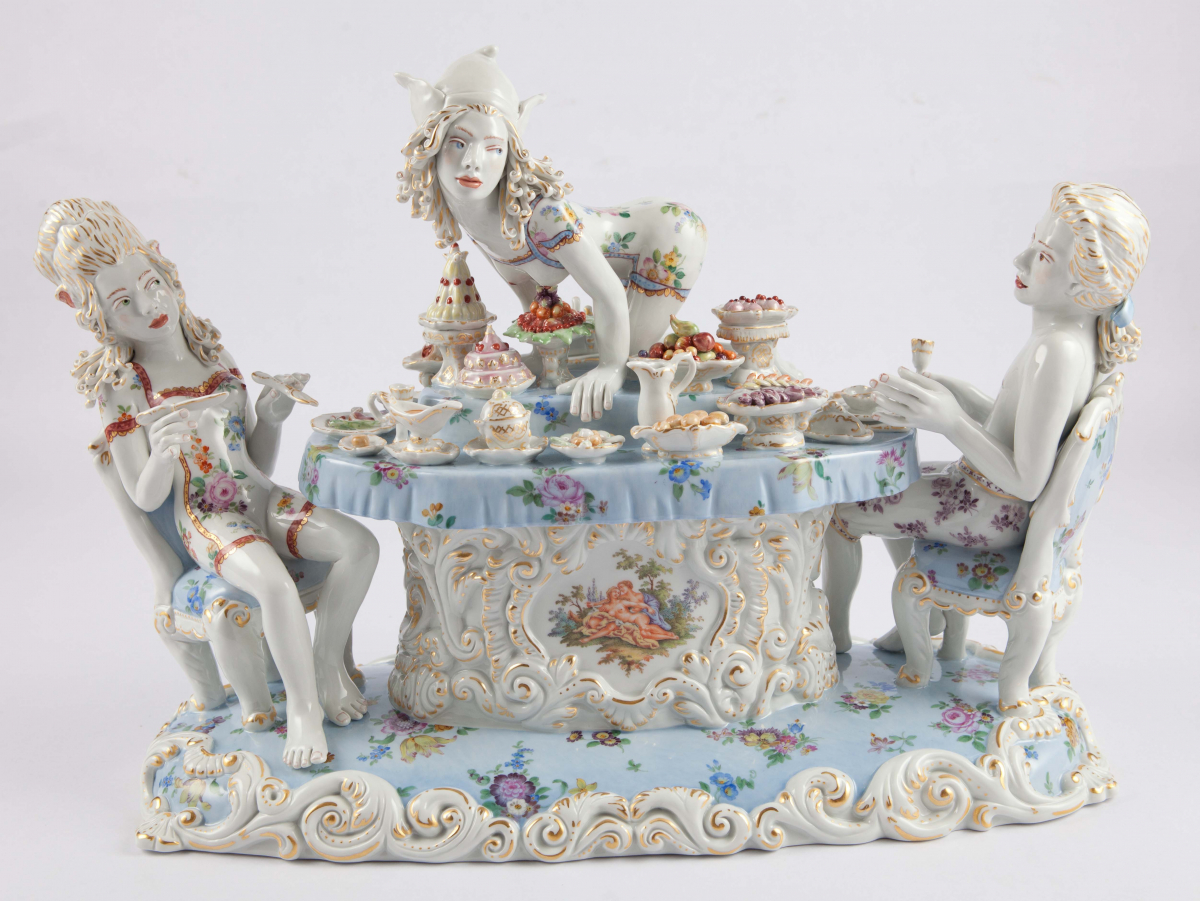 Using the Garden of Eden as her metaphor, Antemann has created a contemporary interpretation of the eighteenth-century banqueting craze by inserting her scantily clad male and female figures. Posed in intimate and playful vignettes of seduction, Antemann’s figures convey narratives of domesticity, social etiquette, and taboos while making formal references to classic Baroque MEISSEN figurines. The ceramist invents a new narrative on contemporary morality in a setting that evokes the decadence of François Boucher and Jean-Antoine Watteau.