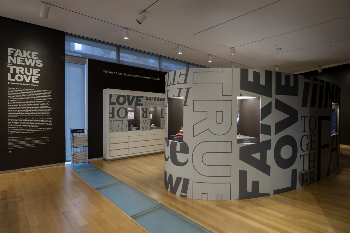 It’s easy to fall into the trap of sensational headlines. Even careful and informed readers must work to resist the pull of fake news, a phenomenon currently dominating American media. In his solo exhibition Fake News and True Love: Fourteen Stories by Robert Baines, the Australian contemporary artist explores this issue through the lens of jewelry. By making up and “fact-checking” news stories to accompany his works, Baines manipulates what is accepted as truth to address the influence that fake news has on our perception of events.