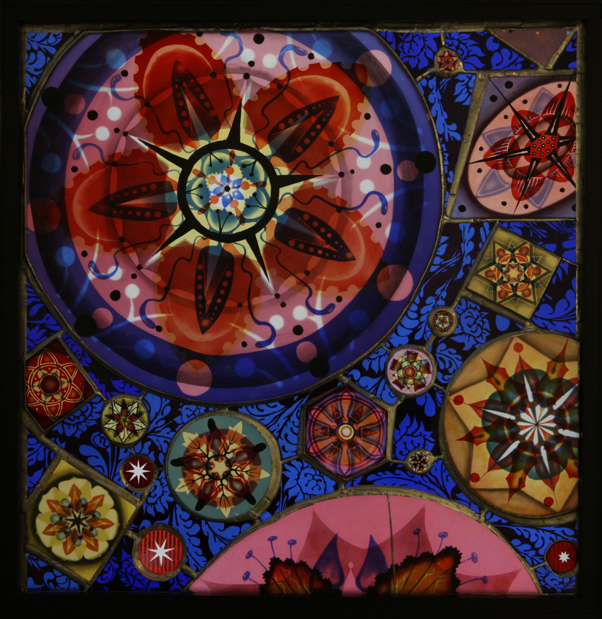 Located in the Museum's light-filled second floor stairwell (B), Judith Schaechter’s Seeing is Believing was commissioned for the Museum of Arts and Design and installed when the Museum opened the doors to its new building in 2008. Schaechter’s early career paralleled the high point of the Pattern and Decoration movement, which championed the use of ornamentation and female-driven subject matter in order to fight the legacy of male-dominated Modernist austerity. Seeing is Believing exploits the power of such patterning, in the form of two hundred unique, geometric images that evoke infinitely variable snowflakes, and brings to the fore what would usually be reserved for background design. Schaechter’s work taps into the long-standing connection between stained glass and light that manifests itself in a sense of spirituality or holiness. Seeing is Believing is a contemporary reimagining of the medieval rose window, as evidenced in the kaleidoscopic arrangement of color and pattern.
