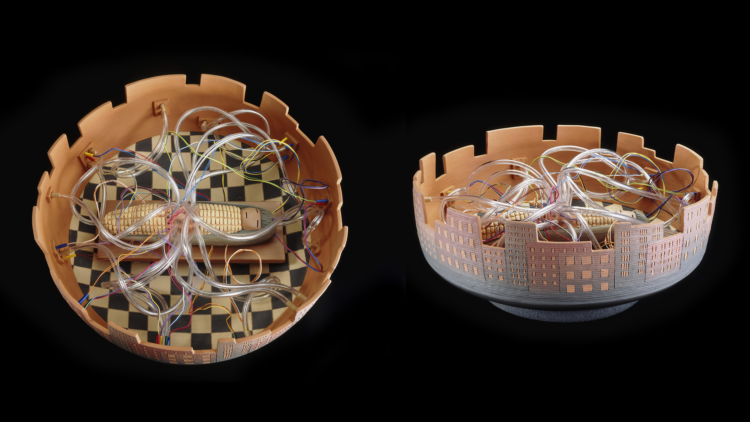 Richard Zane Smith (United States, b. 1955) Beans and Squash Lament ... "What Have They Done to Our Sister?", 2000 6 1/4 x 14 x 13 1/2 in. (15.9 x 35.6 x 34.3 cm) Polychromed earthenware, plastic tubing, colored plastic coated wire Museum of Arts and Design, New York, purchase with funds provided by Giorgio and Nancy Olnick Spanu, 2001