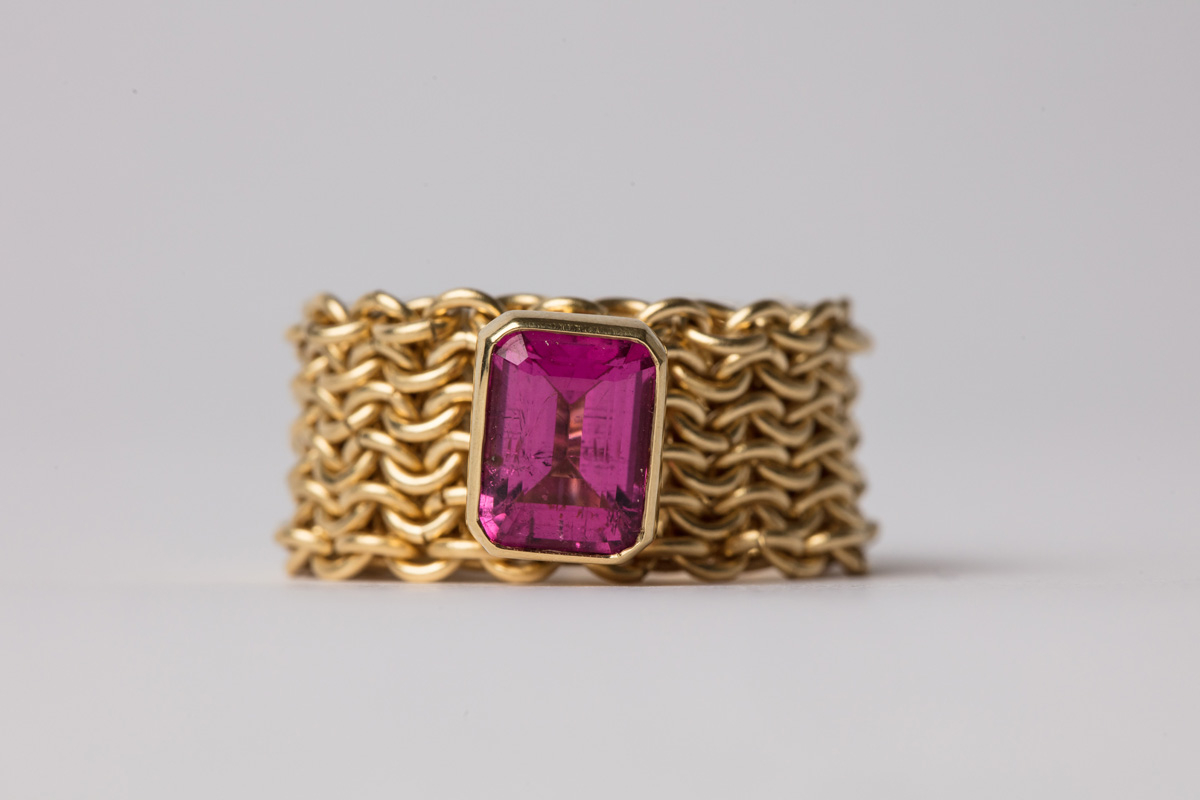 Alison Evans is well known for the exquisite jewelry she creates using the techniques of chain mail. Her work focuses on touch and movement as she explores how a material as hard as metal can be transformed into a substance with textile-like qualities, falling and moving in a way that accentuates the curves of the human body. Evans makes each link individually, using 18-carat gold and silver wire. In some respects the chain mail could be considered a canvas that she decorates using contrasting metals or stones. These effects create an intriguing and beautiful collection of necklaces, bracelets and earrings.