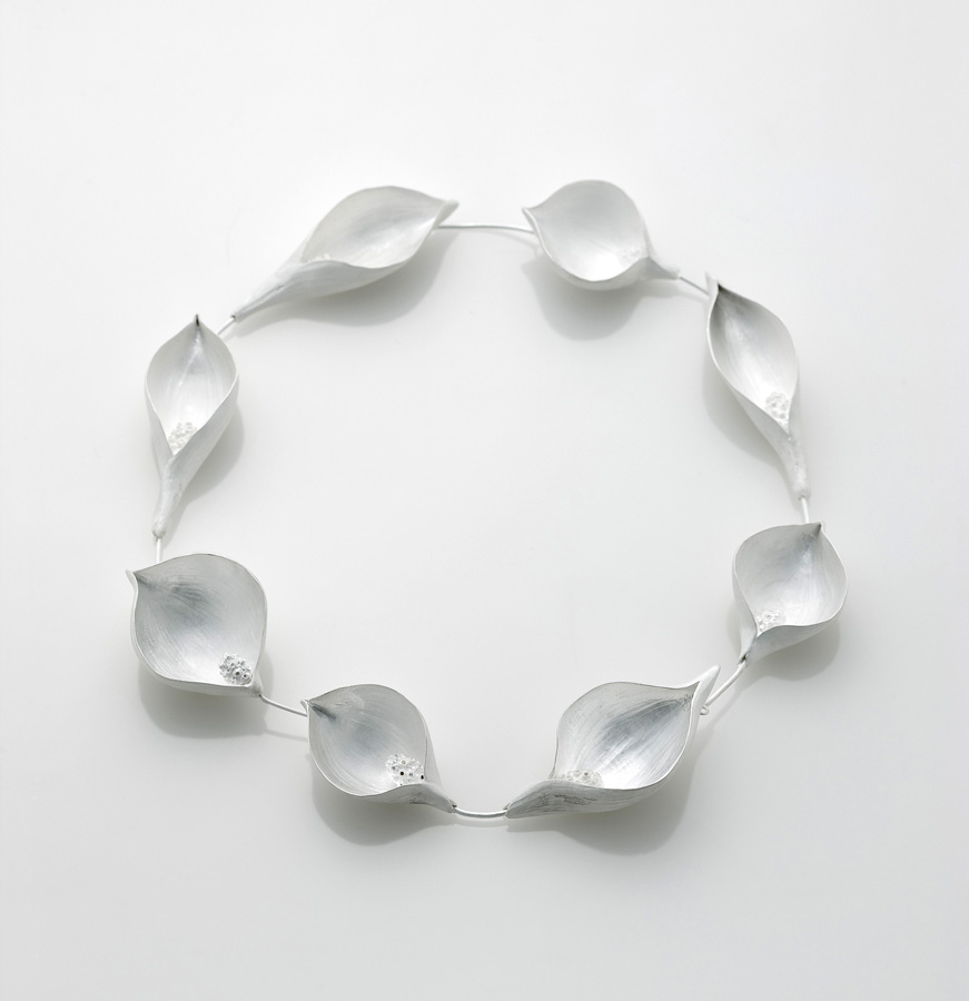 South Korean artist Heejin Lee seeks to translate the unique figurative characteristics of wildflowers into jewelry. Working primarily in silver and gold, she makes achromatic pieces that evoke the brightness and delicacy of the flowers and, through the interplay of light and shadow, emphasize their harmony with the surrounding nature.