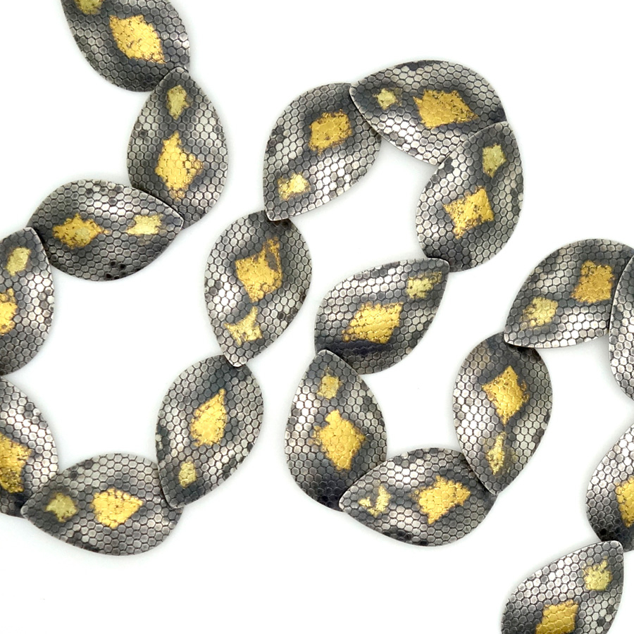 A studio jeweler based in England, Jessica Briggs makes distinctive, very wearable textured jewelry. Briggs, who worked as a textile designer for ten years, brings a love and knowledge of pattern and texture to her jewelry design, which is characterized by the use of low-tech methodologies. She studied keum-boo, an ancient Korean technique for fusing fine gold foil to silver, under a Korean tutor, and was quick to foresee its potential when combined with her experimentations in texturing silver. While keum-boo is widely taught now, Briggs pioneered its use in the United Kingdom, and her work continues to be at the forefront of experimentation and quality.