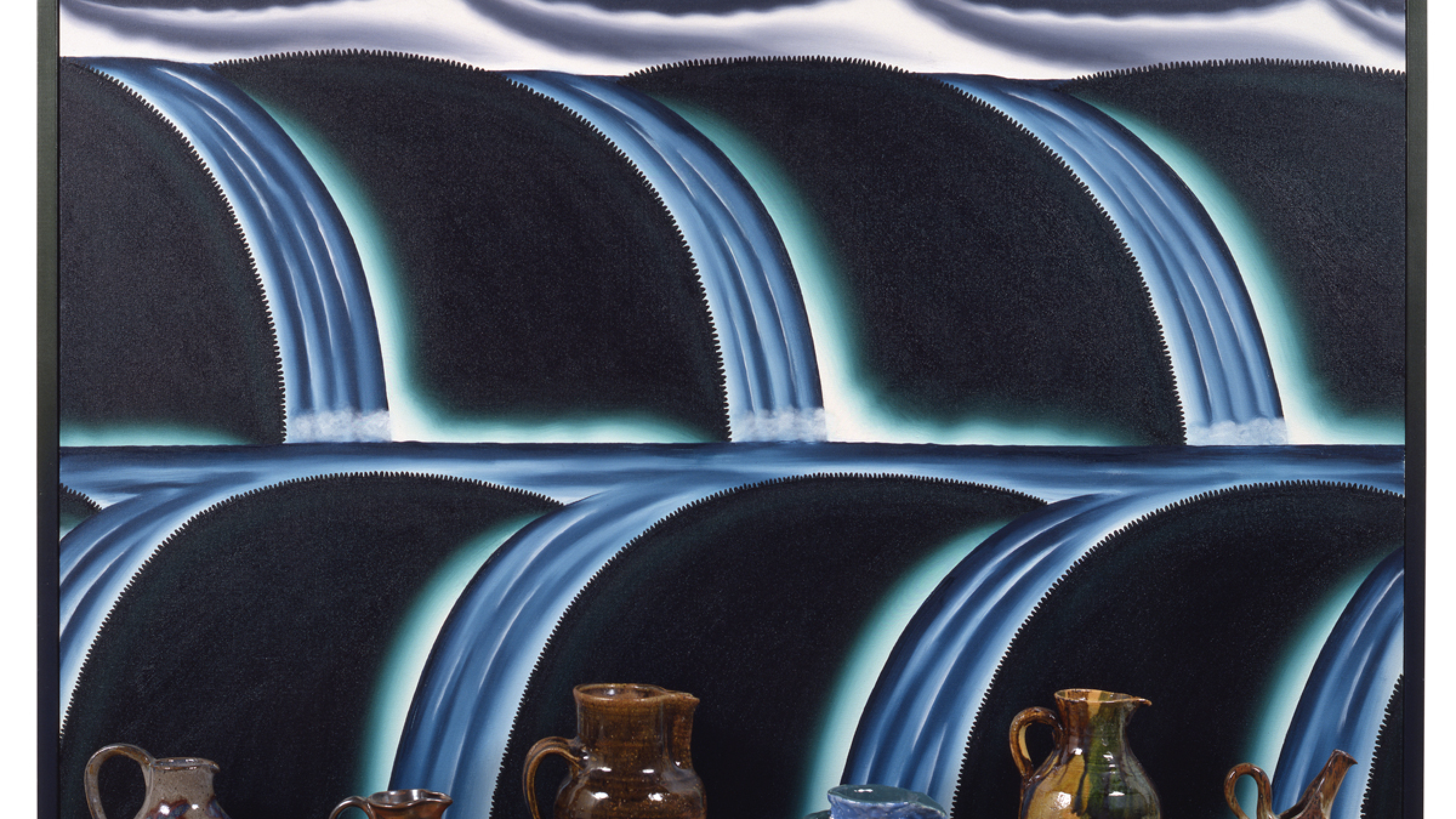 Frothy waterfalls flow into an array of pitchers in Virtual Still Life #15 Waterfalls and Pitchers (1995); mugs arranged by height mirror the rugged mountain range of Virtual Still Life #11 Mugs and Mountains (1995); and a harmony of color blends seamlessly from canvas to a singular pot in Virtual Still Life #5 Elegant Pot with Gold Sky (1995).